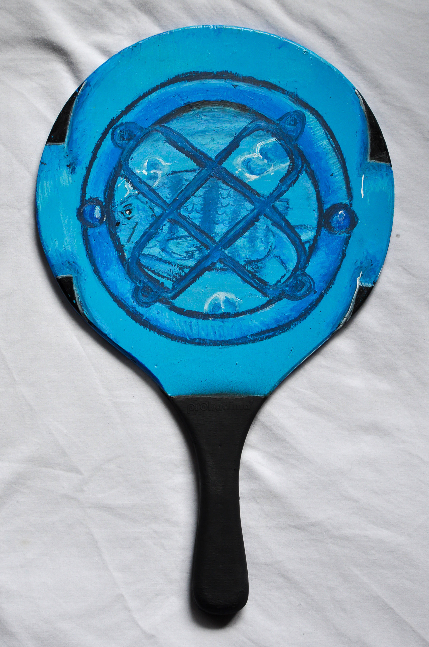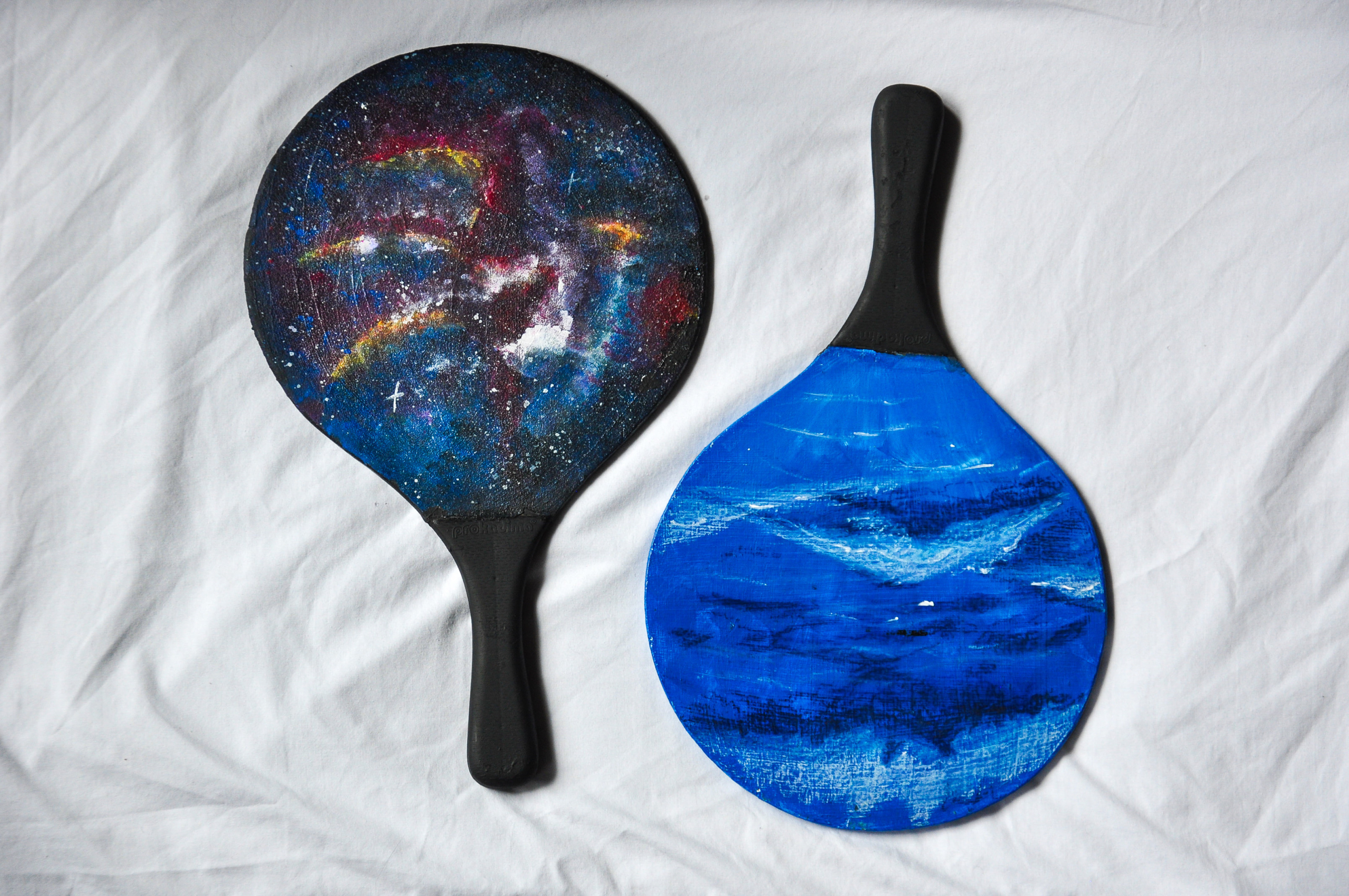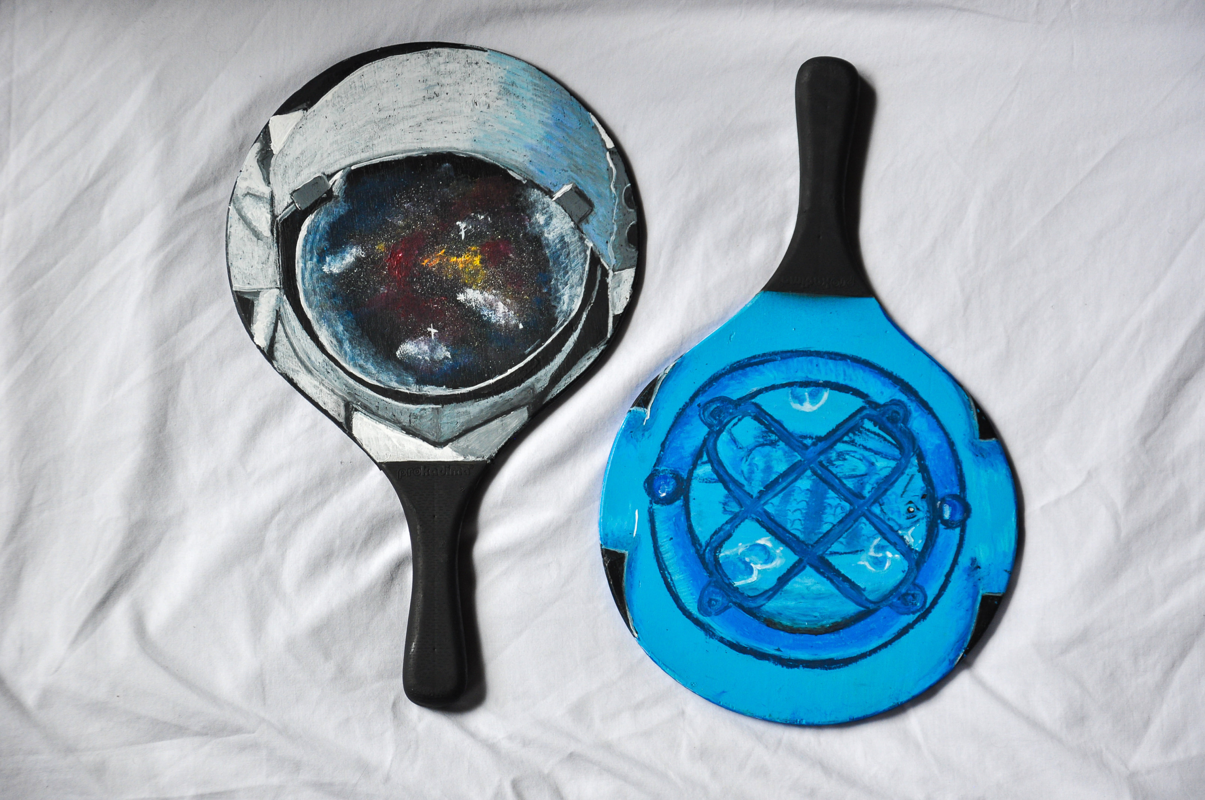 Acrylic, oil pastel, and spray paint on repurposed ping pong paddles.