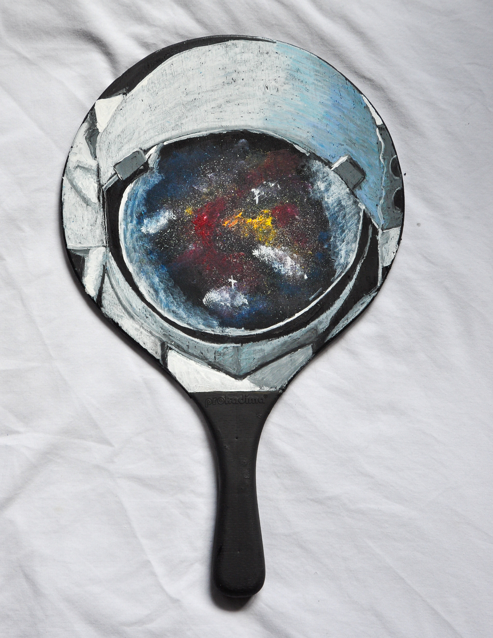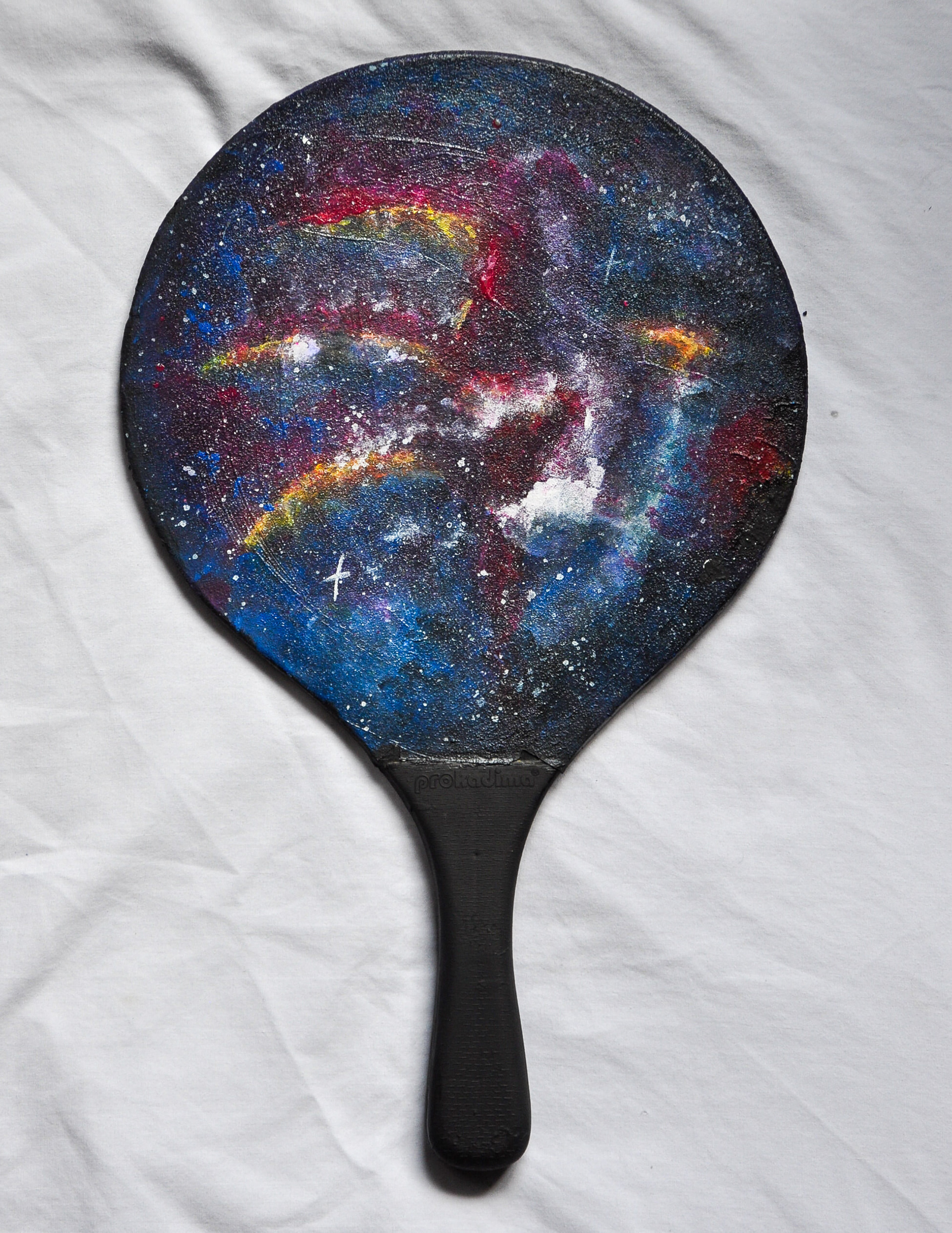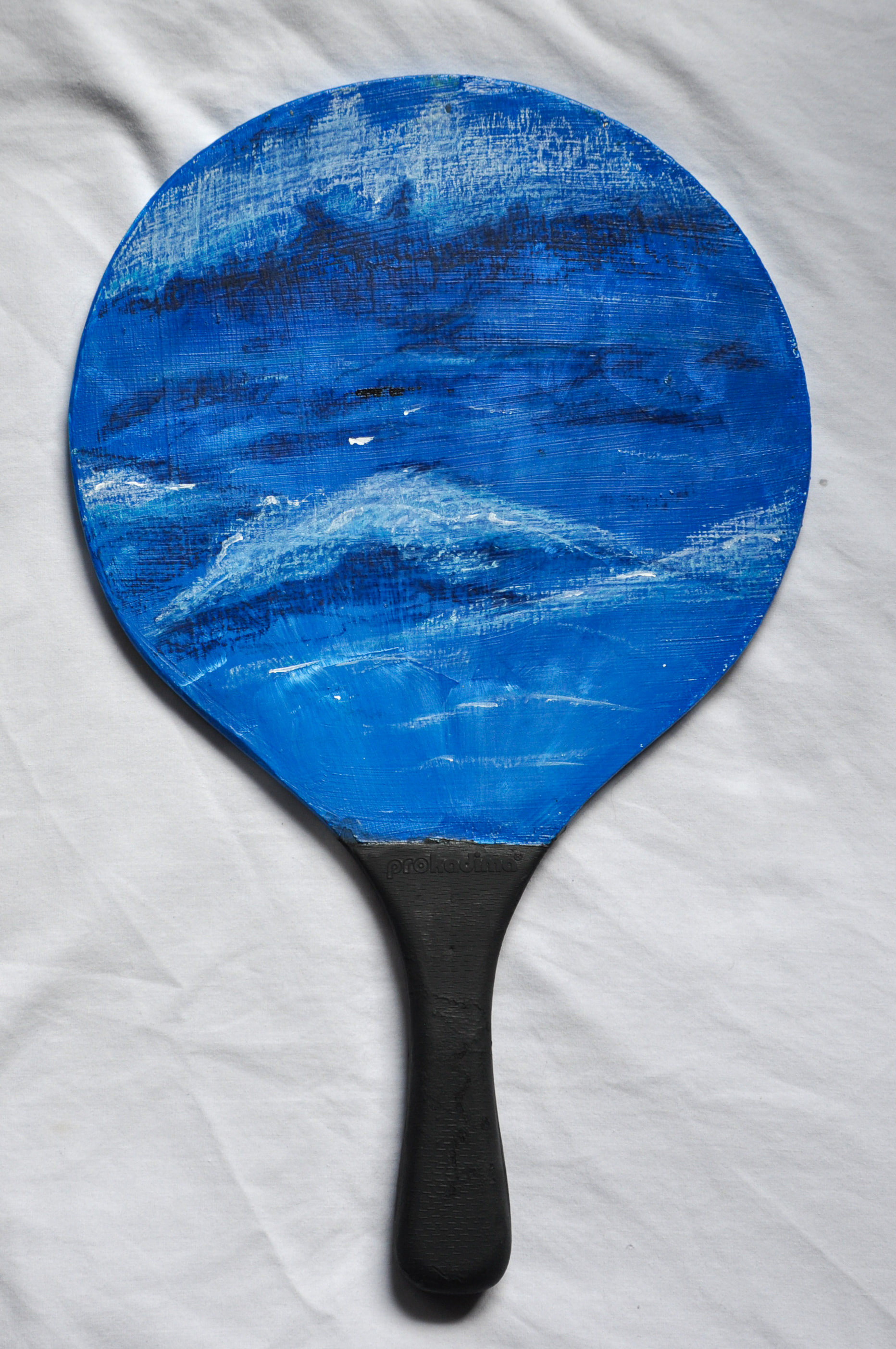 Acrylic, oil pastel, and spray paint on repurposed ping pong paddles.